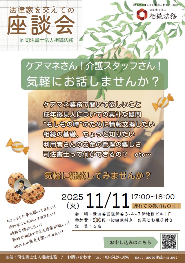 今回は、ケアマネージャーさん、社会福祉士さん、ヘルパーさんなど、介護に従事している方をメインに法律家(司法書士)と意見交換、情報交換、豆知識、お困り相談、司法書士の仕事についてもお話したいと思っております。